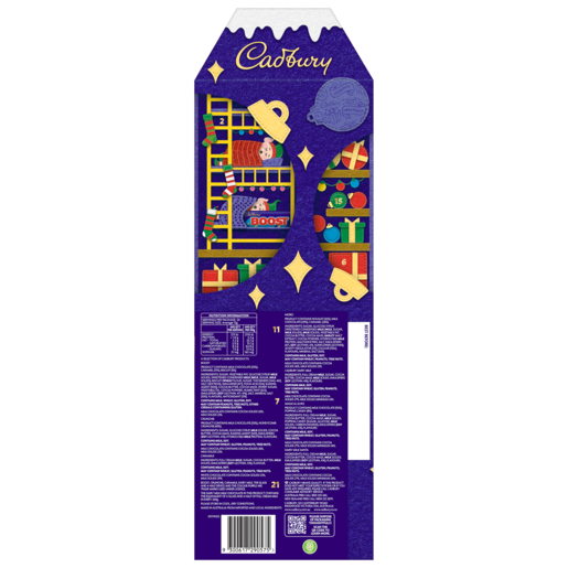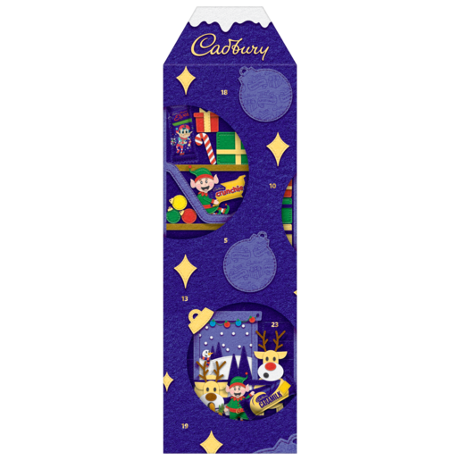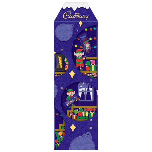 Make the countdown to Christmas is extra fun with this 3D Cadbury Christmas Advent Calendar. Join Santa in his magical world. discovering a chocolate treat behind every window including Crunchie. Caramilk piece. Cadbury Dairy Milk pieces. Magical Elves. Cadbury Dairy Milk Santa. Boost. and Moro.